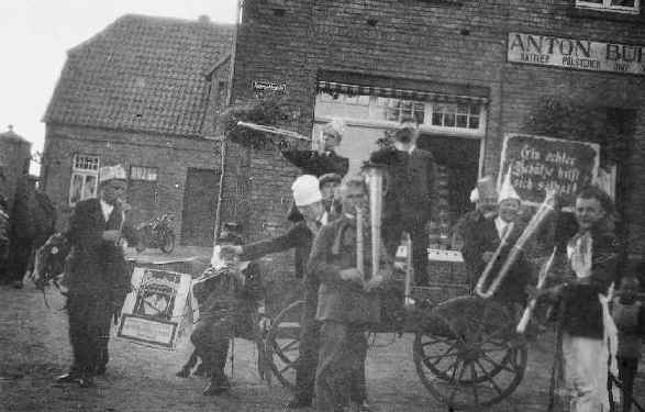 offiziell in den Stadtakten vermerkt. Ausgelassene Schützenbrüder und Ehrengardisten bei ihrem ersten "Dienstagsumzug",1934, - mit Düpmeiers Eselwagen auf der Schürenstrasse vor dem Haus Bühren.